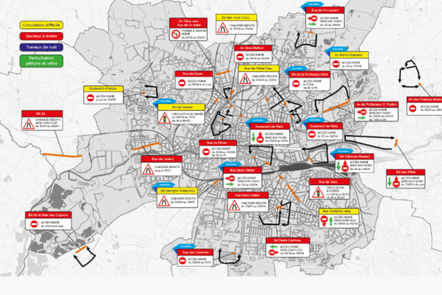 Rue Saint-Hélier : du lundi 20 au vendredi 24 avril, la circulation sera interdite dans le sens est>ouest entre le boulevard René Laënnec et l’avenue Jean Janvier, afin de permettre à Rennes Métropole d’intervenir sur le réseau d’assainissement. Une déviation sera mise en place par le boulevard René Laënnec, l’avenue Aristide Briand, le quai Dujardin, le pont Pasteur et l’avenue Jean Janvier.
