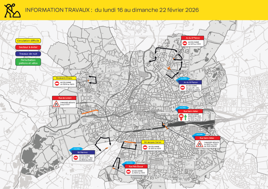Avenue du Général Georges S. Patton : jusqu’à mars 2026, la circulation est interdite entre l’avenue de Rochester et la rue Franz Heller, dans le cadre de l’aménagement du carrefour Patton/Rochester. Une déviation est mise en place par l’avenue de Rochester, la rue Guy Ropartz et l’avenue des Monts d’Arrée.